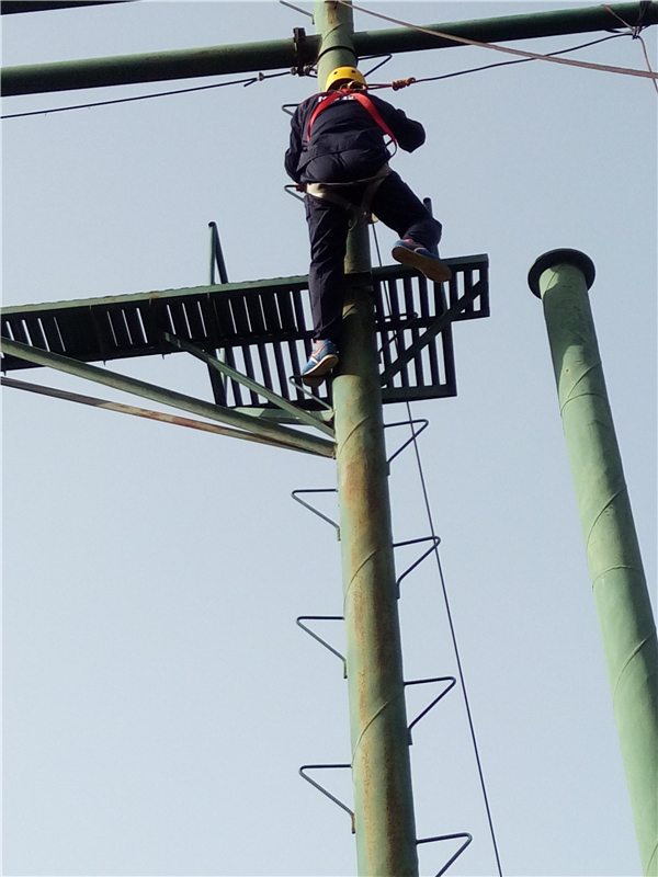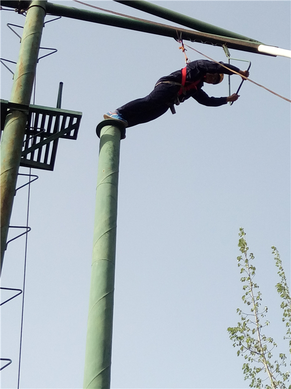 ? ? 這個項目是“高空抓杠”。要求隊員依次獨(dú)立的爬上立柱,在圓盤上站穩(wěn)后,雙腿同時用力蹬出,雙臂前伸抓住掛在前方的單杠。